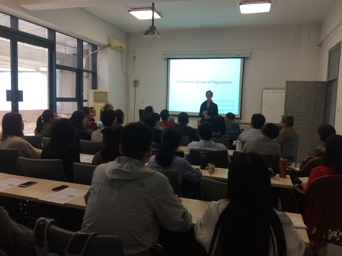 在随后的报告中,Jany-Catrice教授首先简要介绍了法国调节学派的知名学者,包括Michel Aglietta, Robert Boyer, Andre Qrlean,以及他们在研究福特主义、不同资本主义制度的调节理论及金融理论等领域对调节学派的重要贡献。她简要地将调节学派的共有思想总结为不同于主流经济学的特点、研究长期的经济与社会结构的融合方式、采用跨学科的研究方法。在介绍调节学派理论基础时,Jany-Catrice教授通过匈牙利政治经济学家卡尔·波兰尼(K.Polanyi)的《大转折》和法国历史学家费尔南·布罗代尔(F.Braudel)对法国历史的研究的实例,介绍调节学派跨学科的理论根源,重点指出其研究资本主义系统动态变化的政治经济学本质。进而,Jany-Catrice教授通过对比主流经济学和调节学派,介绍了调节学派聚焦的七个问题,包括资本主义经济需要何种基本制度、如何整合这些基本制度实现经济的稳定等等;介绍了调节学派的理论基础,包括在金融制度、市场的社会属性、竞争类型、工资制度、企业组织等方面的基本观点。随后,她简要介绍了调节学派遵循的研究方法、各种调节的类型、亚洲各国的调节特点。Jany-Catrice教授任职于法国里尔一大社会经济研究实验室,现任法国政治经济学学会主席。