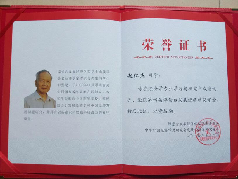 2016年7月2日,“第四届谭崇台发展经济学奖学金颁奖仪式暨第十届中华发展经济学年会”在重庆召开,我院硕士生赵仁杰荣获第四届谭崇台发展经济学奖学金。