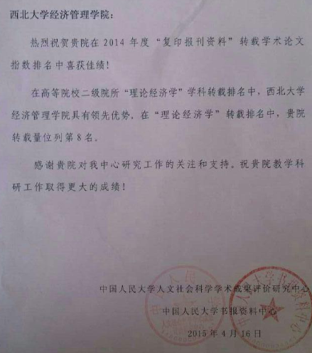 我院理论经济学在2014年度“复印报刊资料”获转载学术论文指数第8名