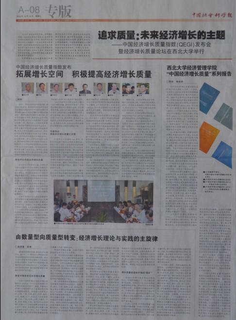 中国社会科学报整版报道我院召开的中国经济增长质量指数(QEGI)发布会暨经济增长质量论坛