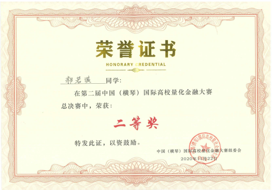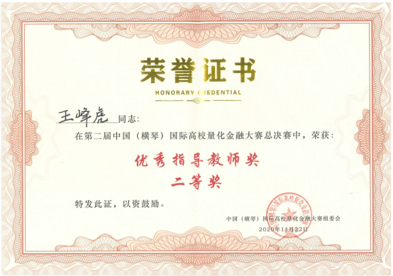 中国(横琴)国际高校量化金融大赛由横琴新区金融服务局、北京大学深圳研究院、清华大学深圳研究生院、中国金融风险量化研究协同创新中心联合主办,是国内唯一的国际化高校量化投资竞赛交流平台。首届比赛有98所高校、360个队伍参赛,我院王子通团队荣获决赛三等奖。