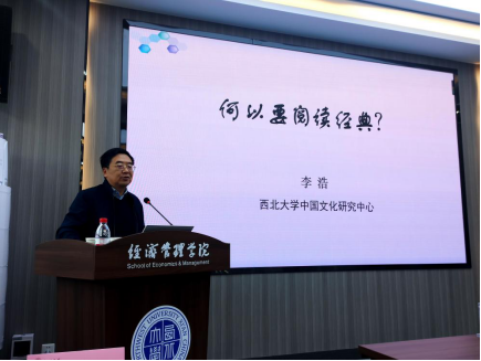 10月17日,我校中国文化研究中心主任、教育部“长江学者”特聘教授李浩应邀为西安市“新生代民营企业家领军人才”研修班做了“何以要阅读经典”专题讲座。776net必赢官网党委书记杜勇,MBA/EDP中心主任郭亚军以及第二期“新生代民营企业家领军人才”研修班学员50余人参加了此次讲座。讲座由杜勇书记主持。
