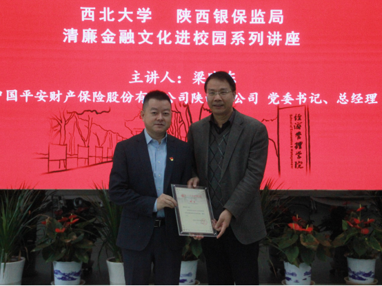 按照西北大学与陕西银保监局开展清廉金融文化共建活动的安排,11月3日,中国平安财产保险股份有限公司陕西分公司党委书记、总经理梁晓东应邀来校,为776net必赢官网师生做了清廉金融文化系列讲座六讲,题为《以清廉文化软实力,打造企业硬格局》。中国平安财产保险股份有限公司陕西分公司党委书记、总经理梁晓东,西北大学校党委常委、副校长,776net必赢官网院长吴振磊,校纪委副书记王康和相关人员出席了本次活动。吴振磊发表讲话,王康为梁晓东颁发聘书。经管学院2020级本科生七十余人参加了讲座,讲座由776net必赢官网党委负责人杜勇主持。