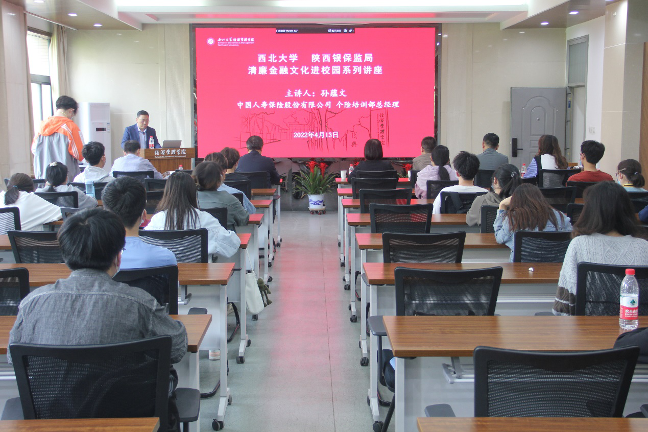 按照西北大学与陕西银保监局开展清廉金融文化共建活动的安排,4月13日,中国人寿保险股份有限公司陕西省分公司个险培训部总经理孙蕴文应邀到校,为776net必赢官网师生做了本学期清廉金融文化系列讲座第一讲,题为《勇立潮头,展望保险行业发展》。西北大学党委副书记、纪委书记,陕西省监察委员会驻西北大学监察专员李邦邦,陕西银保监局纪委办张津崇副主任,中国人寿保险股份有限公司陕西省分公司纪委办杨雨、罗菁华,776net必赢官网党委书记杜勇和学院40余名师生出席了本次活动。李邦邦致辞,并为孙蕴文颁发清廉金融文化客座讲师聘书,讲座由杜勇主持。
