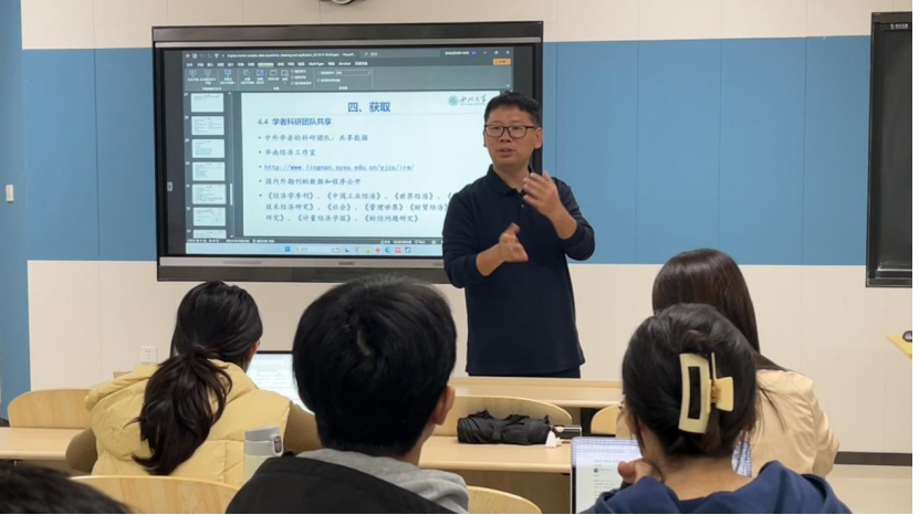 在讲座环节,韩少真老师首先介绍了微观和宏观各层面数据的主要内容,帮助同学们明确数据的主体。其次指出了常见的数据获取渠道,包括上市公司年报公告、交易所和交易机构公布、统计部门、政府监管机构、基本数据库服务商和网络资源等。接着用生动具体的案例提醒同学们一定要关注在数据获取和清洗过程中可能存在的噪声问题。此外,韩少真老师还结合自身科研经验,对常用的国泰安、色诺芬和锐思等大型数据库的使用进行演示,分享了数据清洗的常用代码,并强调了数据来源的明确性和成果的可复制性。最后,韩少真老师向同学们推荐了包括连玉君、李春涛、陈强等科研团队的学习资料,鼓励大家在干中学。通过此次讲座,相信与会研究生对数据库的使用,复杂数据的获取、清洗以及应用有了更加深刻的体会。