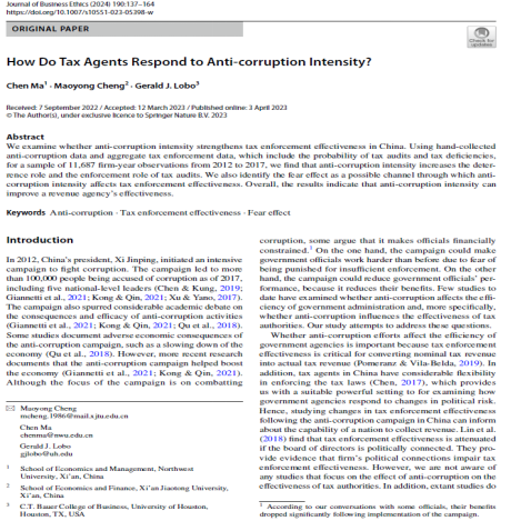 近期,我院供应链会计与审计团队的马晨教授与西安交通大学经济与金融学院的程茂勇教授、美国休斯顿大学的Gerald J. Lobo合作的论文《How Do Tax Agents Respond to Anti‑corruption Intensity》,在FT50权威期刊《Journal of Business Ethics》发表(ABS 4;JCR一区;近五年影响因子8.1)。