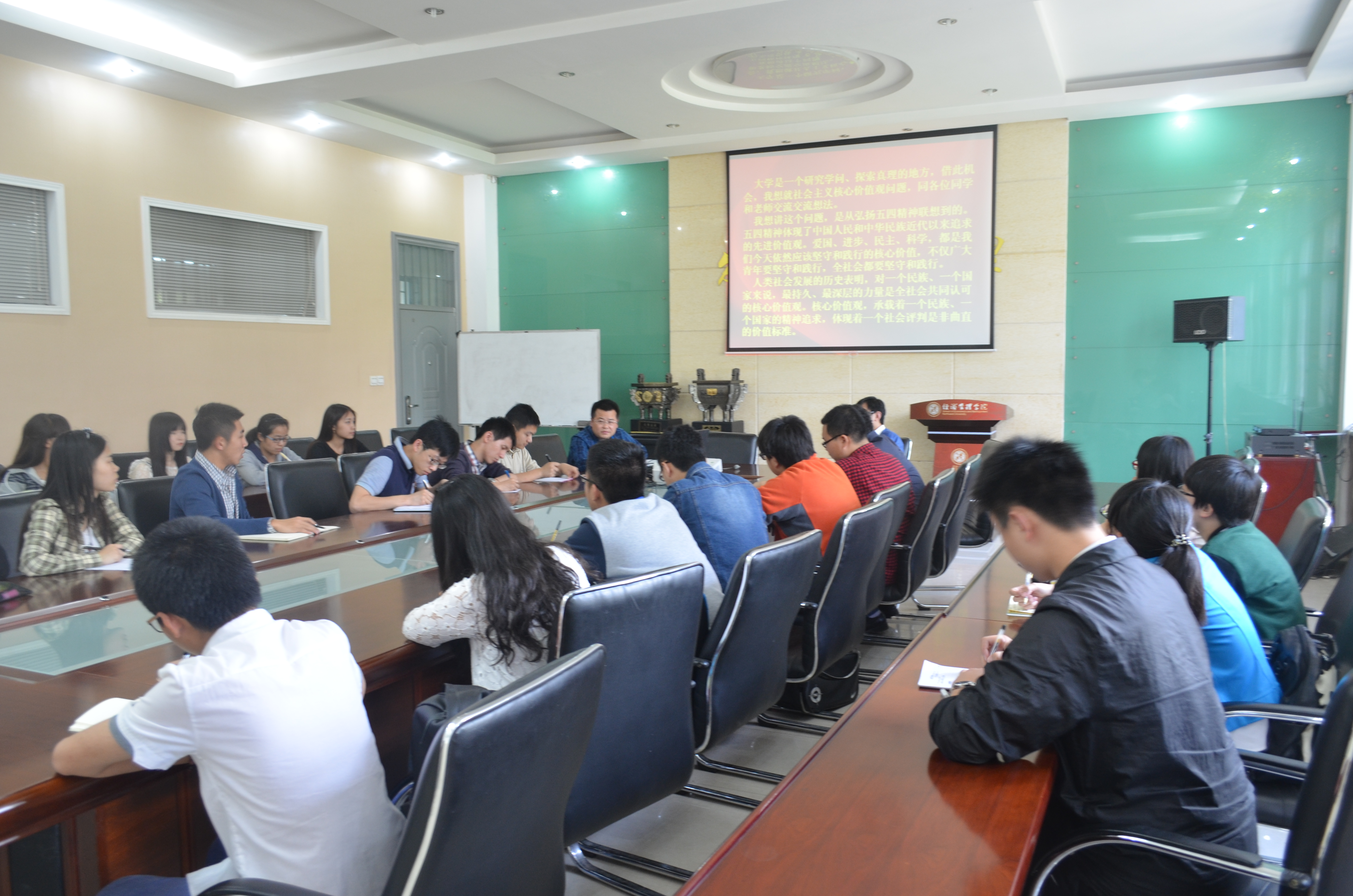 2014年5月12日下午,院团委组织召开了“青年要自觉践行社会主义核心价值观——学习习近平总书记五四北大讲话精神”学习座谈会,会议由院团委负责人主持,院团委、学生会主要干部,部分团支书40余人参加了会议。