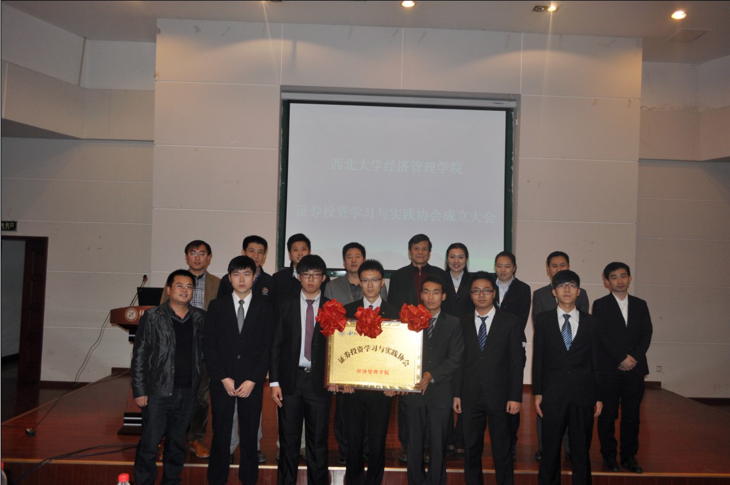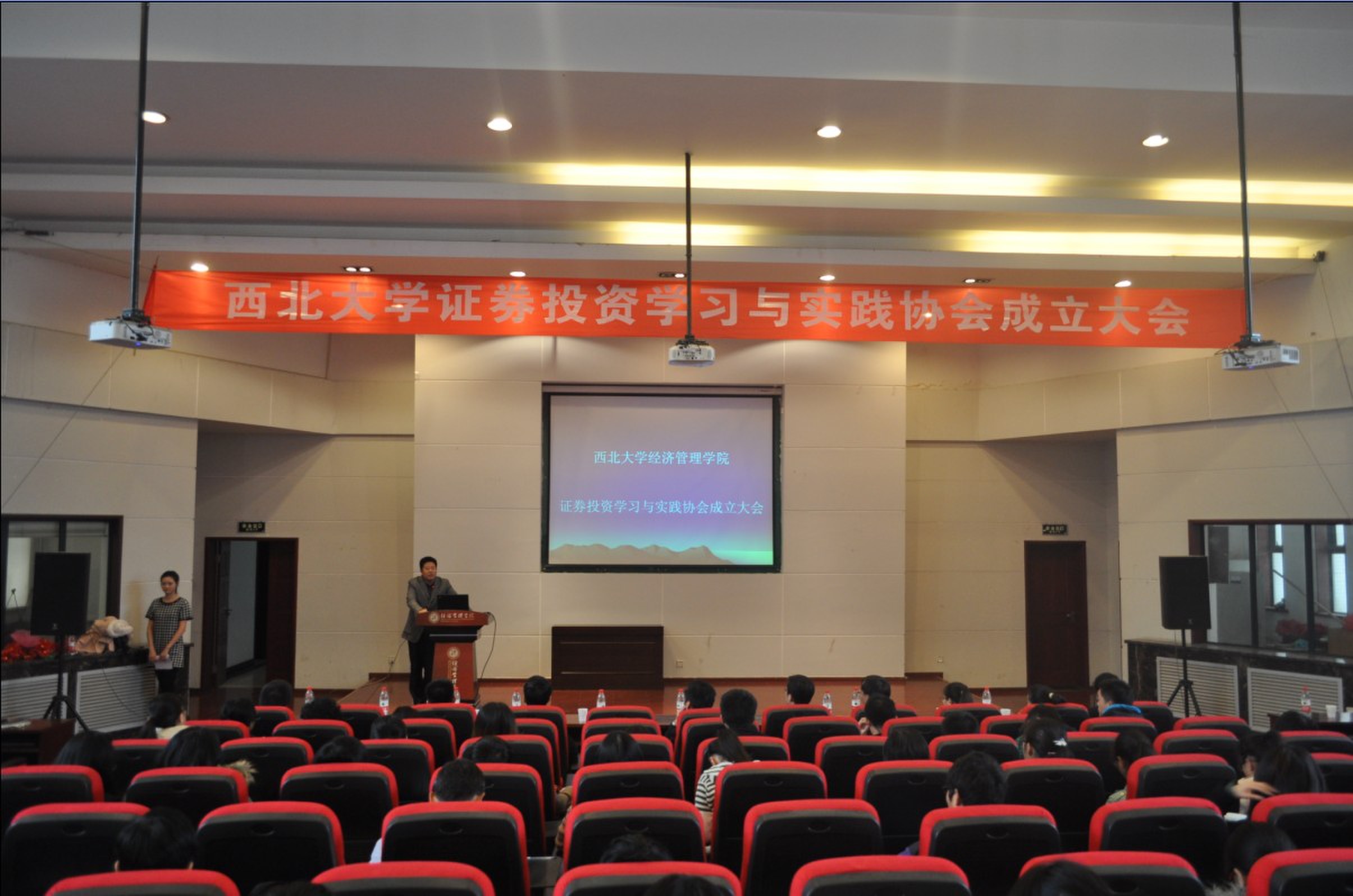 11月13日下午,西北大学证券投资实习与实践协会成立大会在金海恒业报告厅举行。国泰君安西北分公司总经理鲁南先生、院党委副书记李一凡老师、经济系副主任刘瑞明副教授出席,院团委老师和二百多名学生参加了大会。