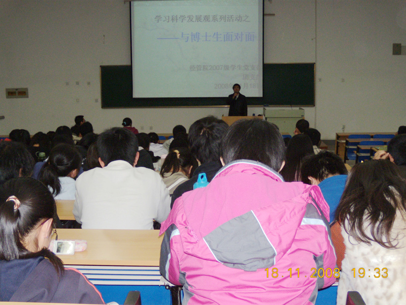 2008年11月18日晚,我院07级学生党支部在2J201教室举办了“与青年博士话学习”学习经验交流会,支部书记张洪杰主持了本次会议,07级党支部100多名学生党员、积极分子参加了交流会,本次交流会是07级党支部在深入落实实践科学发展观、树立优良学风活动中的系列活动之一。